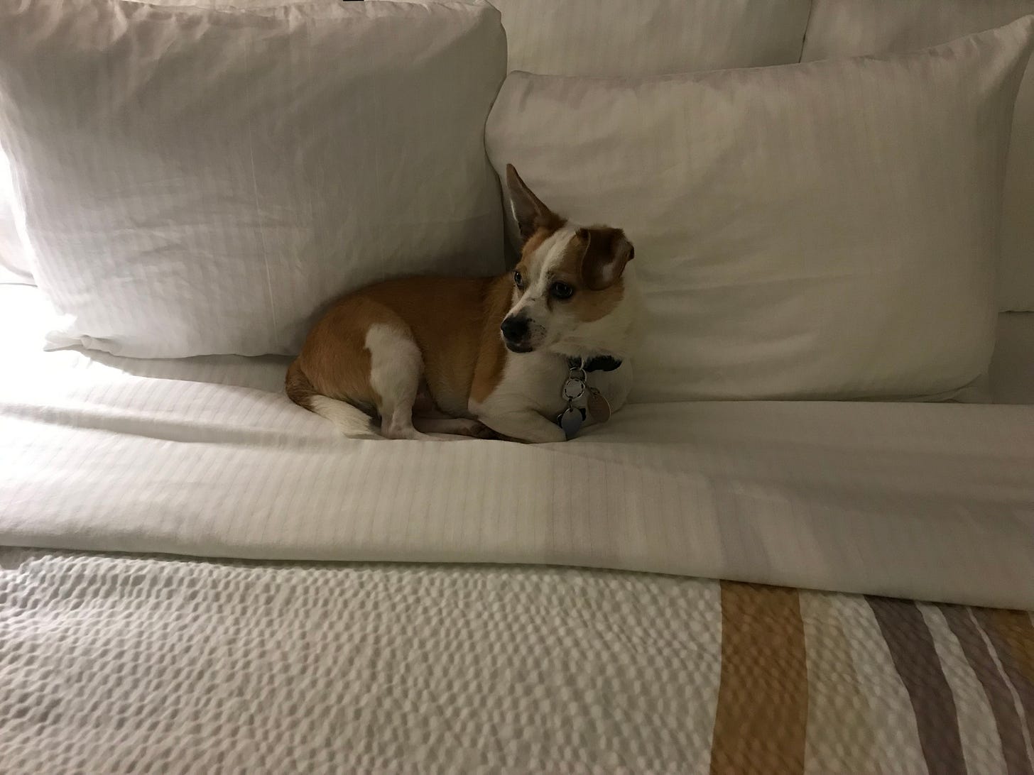 That’s my dog. We were at a pet-friendly hotel on Maryland’s Eastern Shore, and I had to run out for a little while. I left him on the bed, but this is where he was when I returned. Well, they are pack animals.