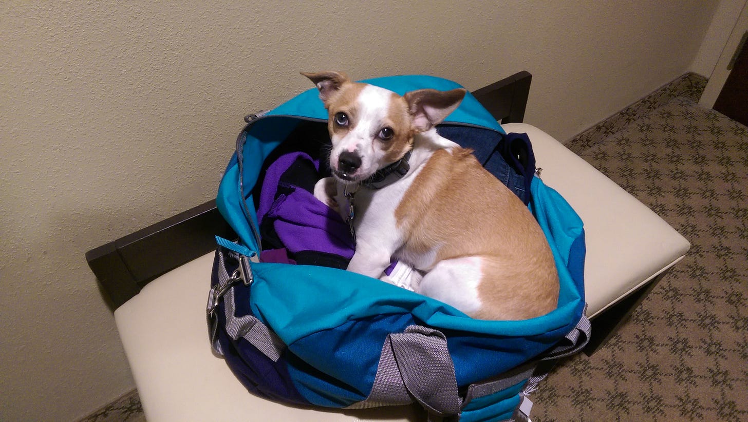 I’ve never flown with a dog, but I’ve taken my dog on road trips. I also have a cat, but, like most cats, he’s not a big fan of traveling. The internet is full of videos of cats out skiing and surfing and rappelling with their people, but those are Adventure Cats, and they are a rare breed. In general, cats are rooted to their home, while dogs are rooted to their pack. A cat likes familiar surroundings, whereas a dog doesn’t really care where she is or where she’s going as long as she’s got her fam with her.