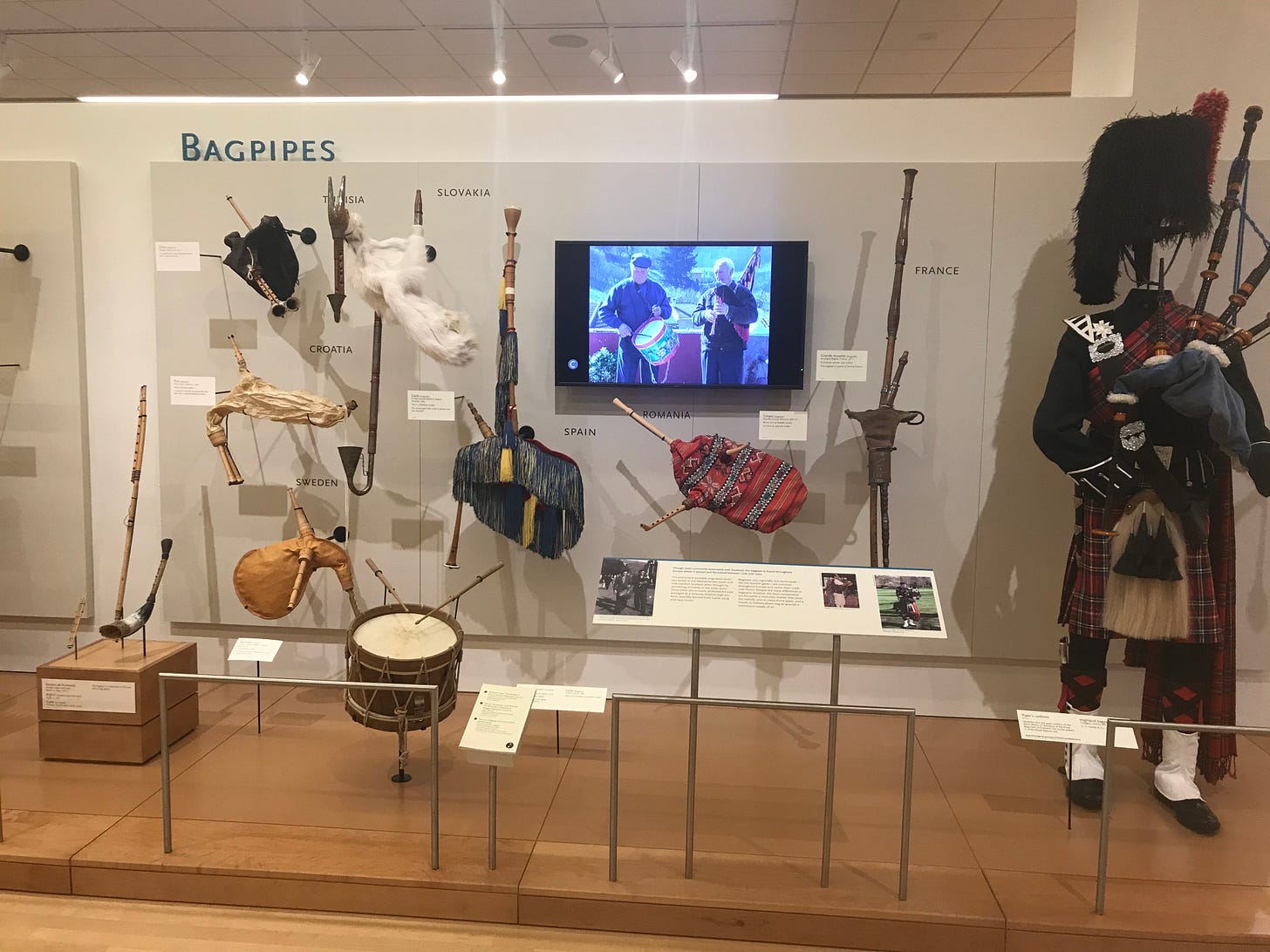 The Geographic Galleries take you to different regions of the world (Africa, the Middle East, Asia/Oceania, etc.), and as you walk through them you see so much more than instruments hung on the walls with explainer cards. There are maps, elaborate costumes, and video loops that show how the instrument is or was made and/or played in its native context. Large, free-standing instruments are displayed like sculptures, so you can walk around them.